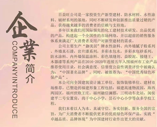 2、福州百益旺公司“鉫美居”天然真石漆采用硅丙乳液、純丙乳液, 高性能、高性價比,優(yōu)異的耐黃變性,耐候性好,耐久性